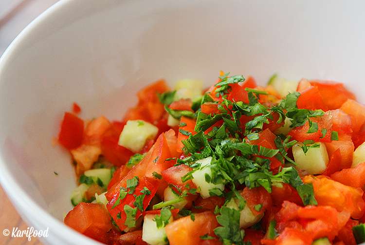 Знакомство с израильской кухней — даже уличной — лучше всего начинать с салата, который так и называется — «израильский». Он представляет из себя мелкую нарезку помидоров и огурцов с зеленью, к нему подаётся плошка с тхиной, и вы на свой вкус заправляете салат соусом.