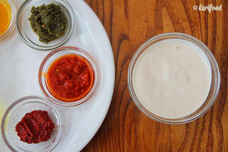 Соусы к питам, хумусу, поджарке готовятся из привезенных прямо из Израиля специй и пряностей, чтобы даже цвет соуса абсолютно соответствовал ближневосточному эталону, к примеру густой тёмный цвет острого красного соуса даёт марокканская паприка, а солнечно-жёлтый оттенок соусу «амба» — манго и куркума из Израиля.