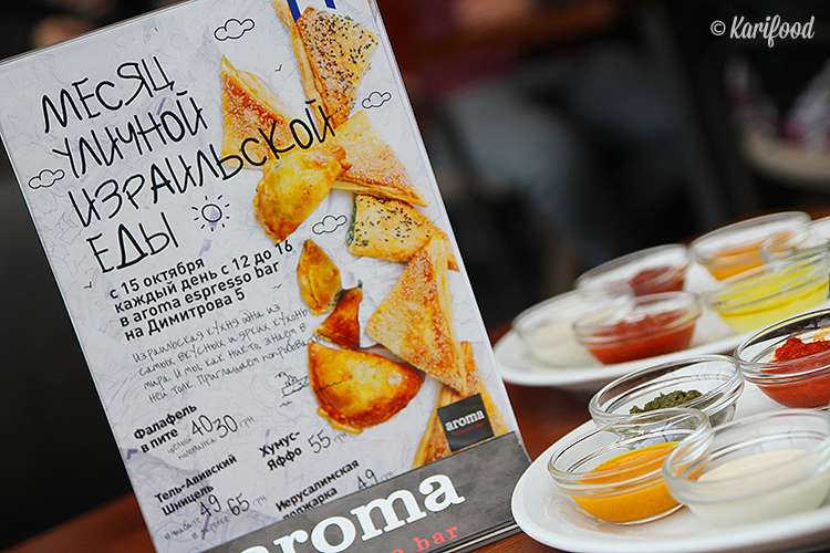 Чтобы воссоздать аутентичные вкусы команде Aroma пришлось немало потрудиться: не могло быть и речи о вчерашних питах или вчерашних фалафелях, лишь разогретых перед подачей. Так что для месячника израильской еды в собственной пекарне Aroma каждое утро пекут свежие питы, а фалафель — шарики из нута с зеленью и специями — жарят только после того, как вы сделали заказ.