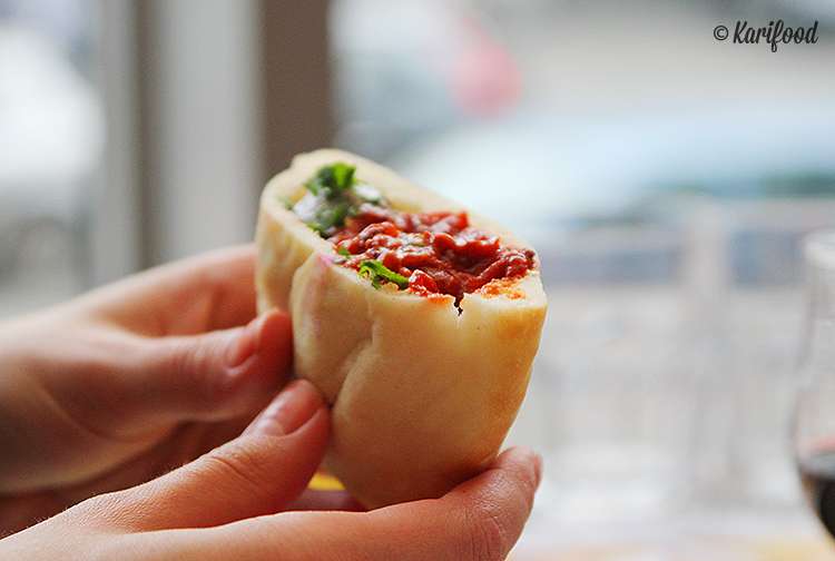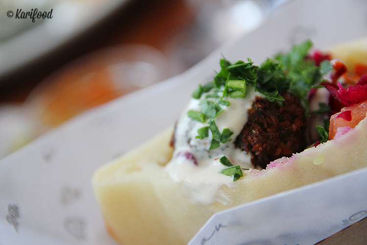 Поэтому отодвиньте нож и вилку, берите питу двумя руками, открывайте пошире рот и кусайте, так что бы разом захватить фалафель с зеленью, соус и невероятно вкусный салат из красной капусты! Если соус капает на стол или салфетки и течёт у вас по подбородку — то вы всё делаете правильно!