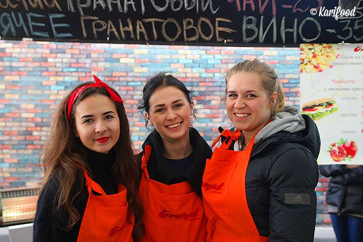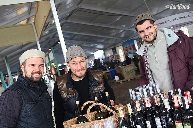 Ещё одним гастро-героем фестиваля стал Андрей Смышленков, человек-огонь, ураган и настоящий джигит (на фото — в центре)! Андрей не только раздобыл старинную кухонную утварь грузинских крестьян, а ещё и его помощники перед фестивалем несколько дней не брились, чтобы иметь очень аутентичный грузинский вид.
