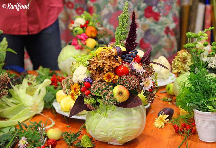Вкусные дары осени вдохновляют не только на кулинарное, а и на любое другое творчество из тех же самых вкусных даров. Например, капусту можно подать на стол и в виде салата, и в виде вазы — бюджетно, красиво и экологично. Ну, а что поставить в такую «вазу» знают флористы из Бюро счастливых подарков Assorti. Мастер-класс от Натальи Допирчук — на самом деле очень творческая девичья встреча с кофе и рукоделием в виде сбора собственного авторского букета в кочане капусты из самых простых материалов, которые либо очень дешевы, либо совсем бесплатны: желудей, каштанов, шишек, берестяной коры, сухоцветов, садовой мяты, веточек укропа или груш, помидоров и садовых яблок.