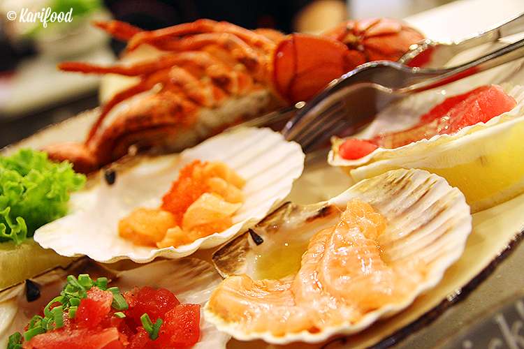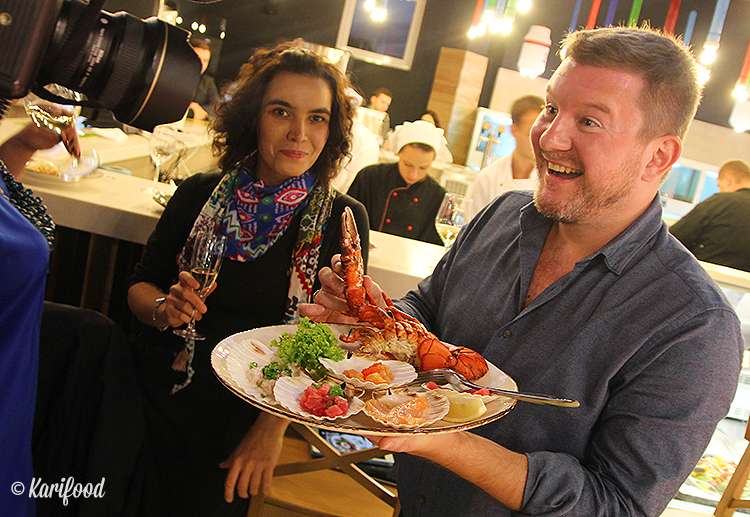 Ледяные витрины и гигантские каскадные аквариумы с крабами, лобстерами, вонголе, морским чёртом и угрем, креветками и ставридой, осьминогами и камбалой, разделочный цех — справа, столики, диваны, энотека — слева, в сердце зала — открытая кухня, где всё самое свежее и вкусное с витрины попадает в ваш рыбный суп, пасту или салат, более того, отправляясь за рыбкой к обеду, вы вполне можете унести из Fish&chick’s и сам обед — take-away к вашим услугам.