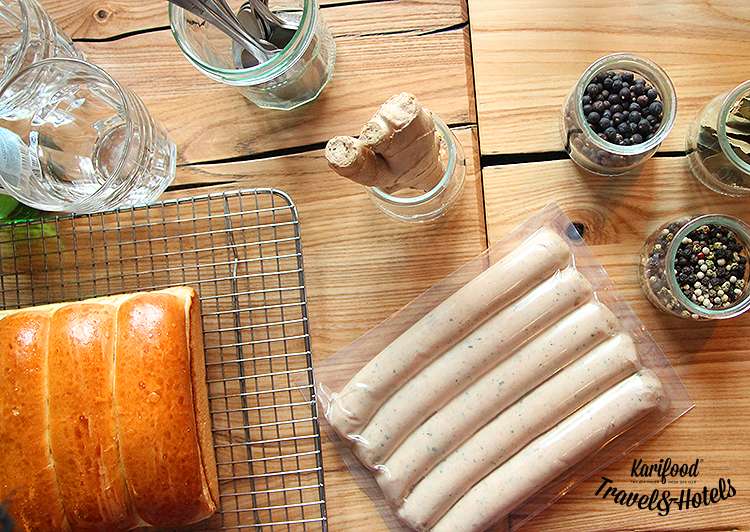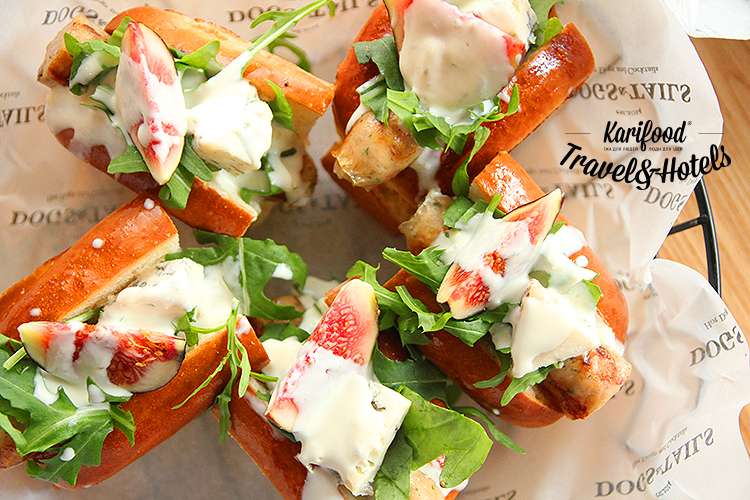 Сосиски в Dogs & Tails готовят сами из куриного мяса, пряностей, специй и с добавлением пищевого коллагена, что, конечно же, влияет на конечную цену готового продукта, зато даёт уверенность: мясо в этой сосиске точно есть!