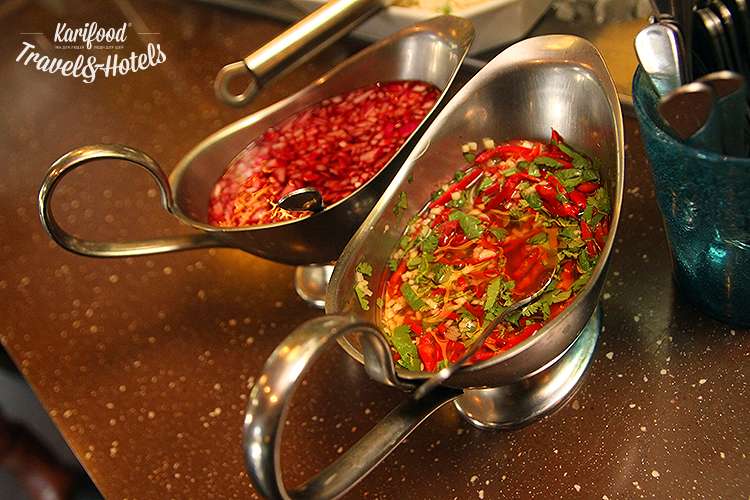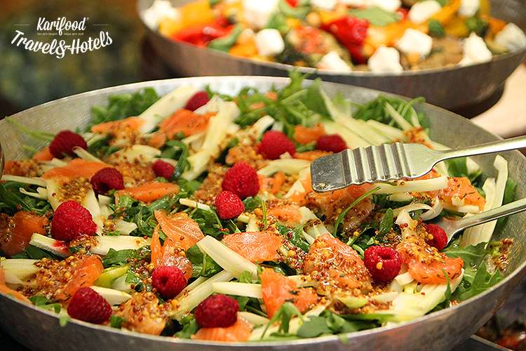 Бренд-шеф Шота Годердзишвили и шеф-кондитер Лео Антониуччи кормят свежайшими суши, сашими, устрицами с просекко, морскими коктейлями и лососем домашнего копчения, на станции гриль для гостей подрумянивают стейки и нарезают запечённую телятину на кости, а в хлебной секции встречают огромным разнообразием хлебов, сыра, мёдом в сотах и виноградом.