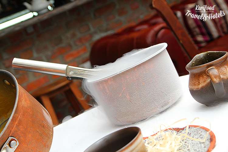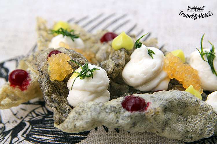 Длится гастро-представление около двух часов, за это время вы успеваете много-много раз удивиться, полюбоваться полыхающим в огне сыром халуми, похрустеть «карасями в сметане», которые подают на рыбной шкуре в виде мусса, насладиться сочными украинскими устрицами в пудре из съедобного снега, зелёной щевелевой граниты и калинового соуса, а ещё попробовать пастилу из корнеплодов, чипсы из гречки, иерусалимский артишок с вяленными томатами, «голую» котлету по-киевски и завершить трапезу печеньем из еловых шишек с чаем на еловых ветках.