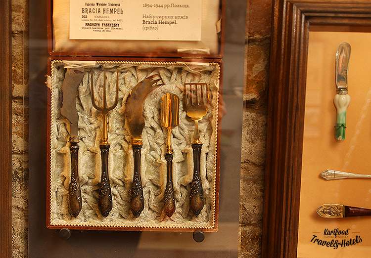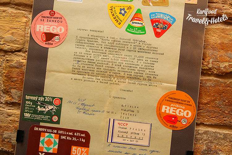 Плюс элегантная витрина с сырными ножами прошлого века и удивительно душевное письмо от чешского коллекционера сырных этикеток (на тот момент в коллекции уже было 25 000 стикеров, обёрток и этикеток), который попросил представителей сырной промышленности УССР прислать ему пару местных образцов сырных наклеек.