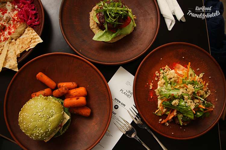 Бургер с тофу и розовым острым луком с хрустящими глазированными морковками, салат с кинвой, хумус с чипсами из лаваша, фалафель, суп и десерт — вот, собственно, и всё меню One Planet. Всё свежее, из-под ножа, повара не кривят носом, если просишь убрать из бургера солёные огурцы, а из фалафеля — заправку из соевого соуса.