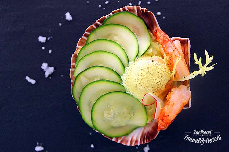 Очень зрелищно тут подают гребешок – в створке из раковины с пюре из зеленого горошка и бекона, с ломтиками огурца и тигровыми креветками.