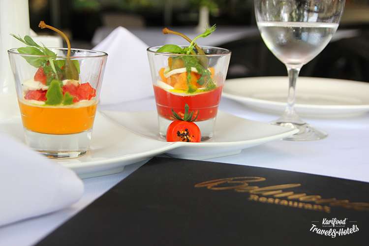 В ресторане французской кухни Belmondo летнее меню открывает закуска из двух верринов – в прозрачных стаканах подают два вида томатной эспумы с моцареллой, каперсами и зеленым соусом. Желтая эспума – пряно-сладкая с луком, красная – огненная с соусом табаско.