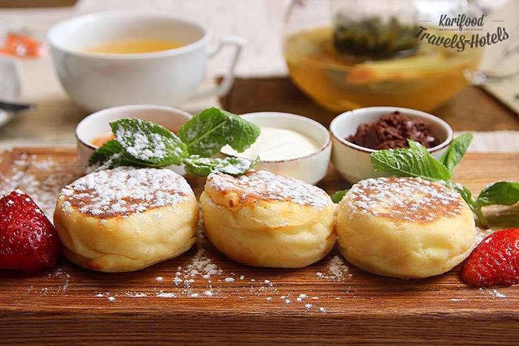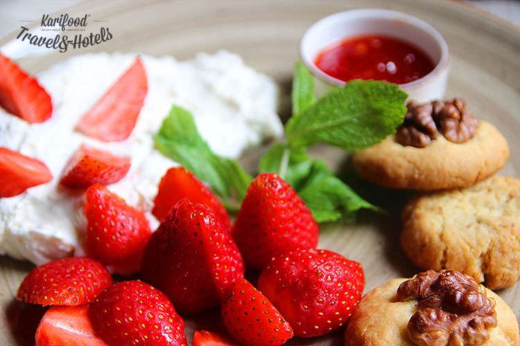 Сырнички из грузинского сыра надуги подают на завтрак, с медом, сметаной, шоколадом и, конечно же, клубникой, закуску из надуги с зеленью, пряностями и несколькими гренками приносят всем гостям в качестве комплимента, и завершает тему с грузинским сыром десерт «как дома».