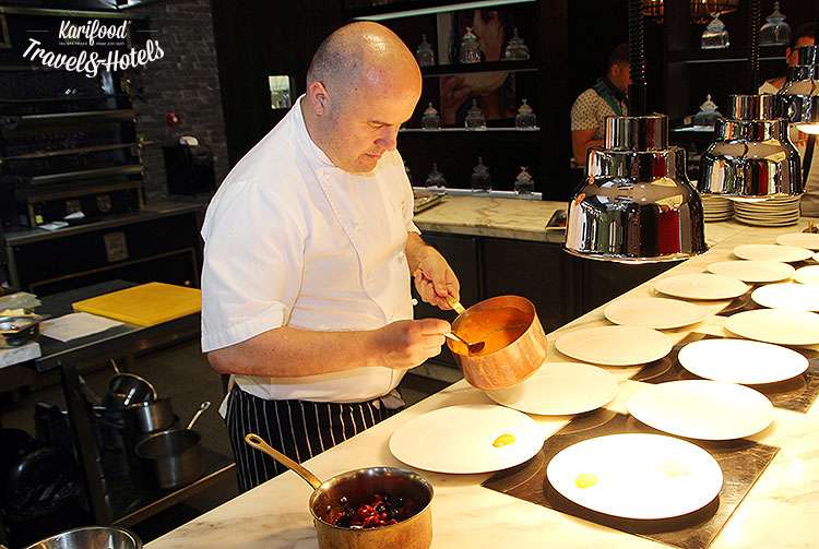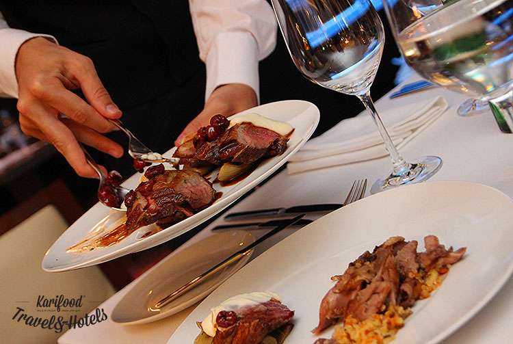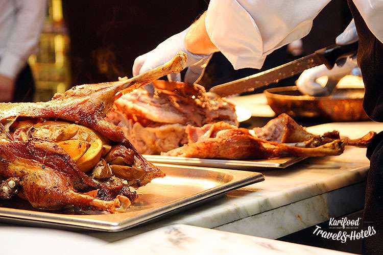Риетт с лесными ягодами, с соусом бальзамико и хлопьями миндаля, утиная грудка с пюре из цветной капусты на печеном фенхеле, канапе с муссом из гусиной печени и главные деликатесы в виде целой гусиной туши, запеченной с яблоками и апельсинами с табуле, цветной капустой и ягодными соусами в исполнении Шота – отличный пример того, как коробочки с полуфабрикатами или просто гусь превращаются в праздничный банкет.