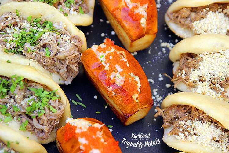 Шеф Богдан Реминский предлагает перевести дух и закусить бао-бургерами с уткой и свининой, вкуснейшими малютками-бриошами (две бриоши в порции) с креветками и домашним майонезом.