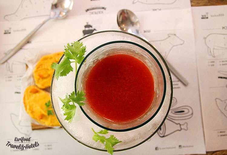 Вкусные летние новинки ищите и в Каркасе у шефа Юрия Приемского. Во-первых, к лету в меню появился гаспаччо, который подают в стеклянной колбе со льдом и тостами из острого тунца.
