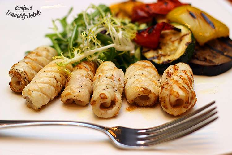 Для лёгкой разминки — дыня с прошутто, для серьёзного обеда — буррата с томатами и зелёным песто, и обязательные кальмары с овощами-гриль.