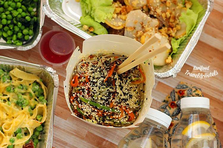 Во-первых, это красиво (о, эти именные коробочки, подписанные каллиграфическим почерком!), во-вторых, вкусно, в-третьих, не нужно никуда ходить! Очень понравился салат с фунчозой, овощами и кунжутом — уже сам по себе целый обед! Хороша и паста с горошком и вялеными томатами, и котлетки из форели с гарниром из шпината и зелёного горошка.