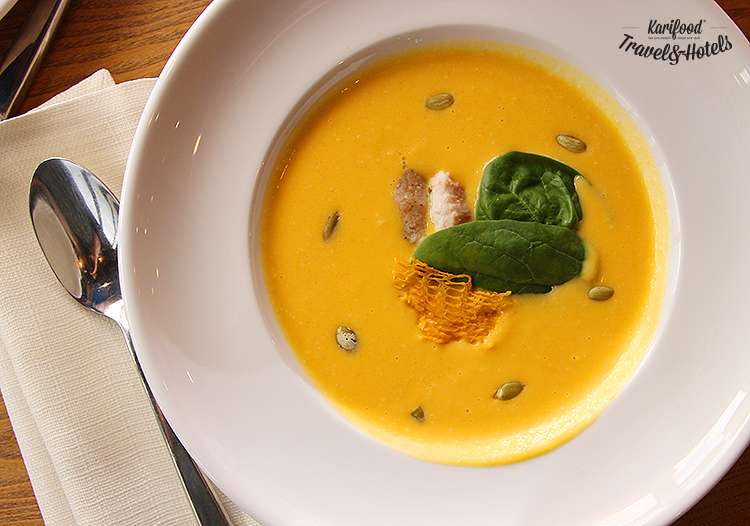 Тыквенный суп в O’Gorod хорош тем, что приготовлен на овощном бульоне с добавлением фенхеля и эстрагона, в каждой ложке приятное послевкусие летних трав.