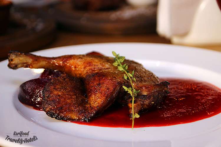 Два абсолютных хита, мимо которых нельзя-пройти-мимо: утиная ножка с кизиловым соусом и торт Монастырская изба.