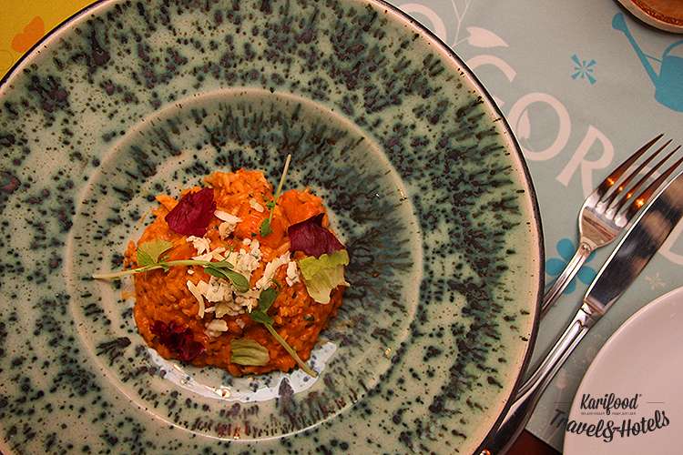 Зелёный салат стыкуется с осенью в воздушном тыквенном муссе и гладких тыквенных жемчужинках. Хит меню — кремовый тыквенный ризотто с сыром дорблю, индейкой и подкопченной паприкой. Для любителей ризотто — must eat!