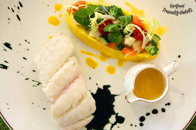 Из основных блюд — классика от Organic Café by Glossary — паровой судак со спирулиной, которого подают с постной полентой, приготовленной на овощном бульоне.