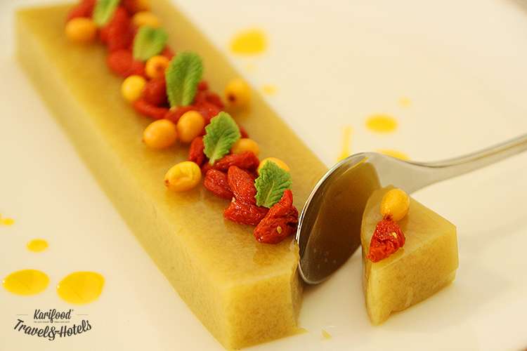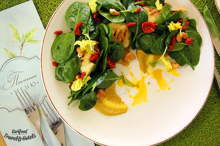 Причём, кувшинчик с соком подают отдельно, а вы уже сами решаете, отважиться на эксперимент с алоэ или нет. В постном меню обратите внимание на веганский салат из шпината, запечённой цветной капусты, с орехами кешью и вымоченными в лимонном соке ягодами годжи и на весенний салат с миксом одуванчикового, оливкового и облепихового масел.