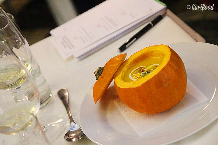 Из меню очень позитивным и осенним оказался тыквенный суп, его варят на курином бульоне, подают на стол в тыквах, заправляют оливковым маслом и посыпают тыквенными семечками. Наравне с супом порадовал салат с телятиной, рукколой, пармезаном и вялеными томатами.