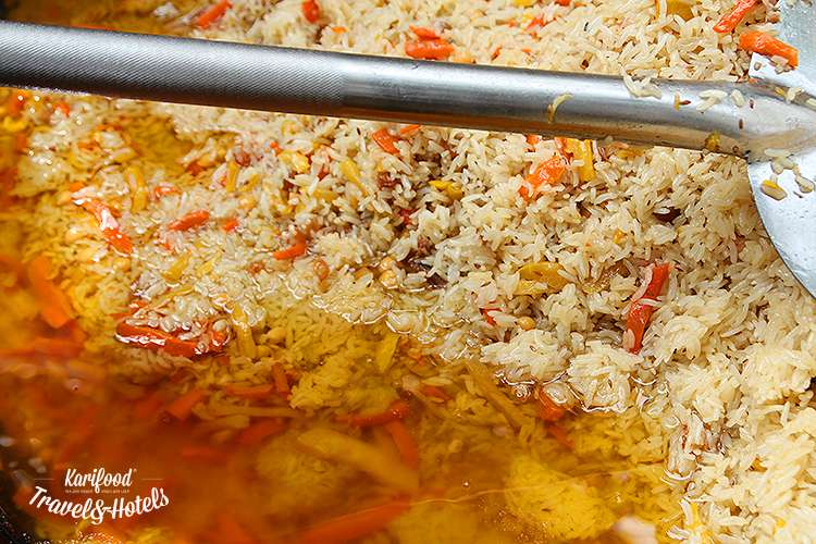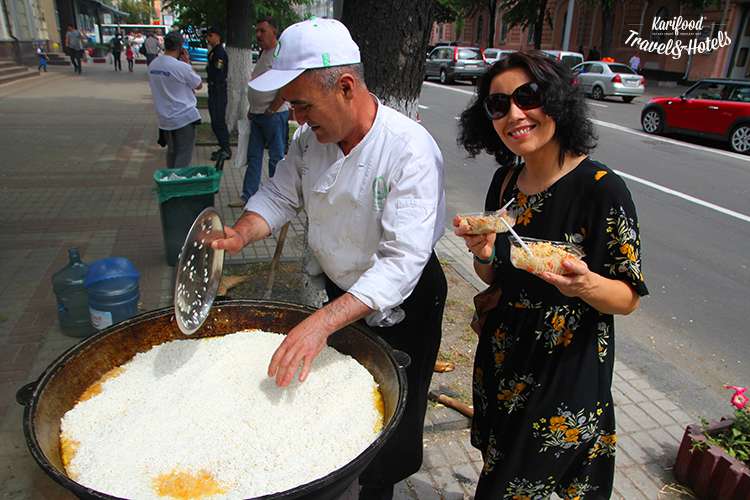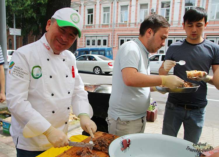 Его варят в огромных котлах возле посольства, это плов на жирной баранине, с изюмом, сладчайшей жёлтой морковью, золотистым нутом. Шеф Олимджан Норбаев — член Ассоциации поваров Узбекистана, и его плов — лучший из лучших, что можно попробовать в Киеве.