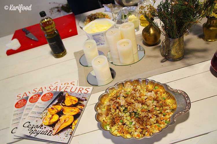К тому же, помимо двух «майонезных» рецептов, шеф-повар приготовил невероятно вкусные вариации оливье с раковыми шейками на растительном масле и с масляной рыбой и крошкой из бородинского хлеба — более, чем достойная альтернатива майонезу!