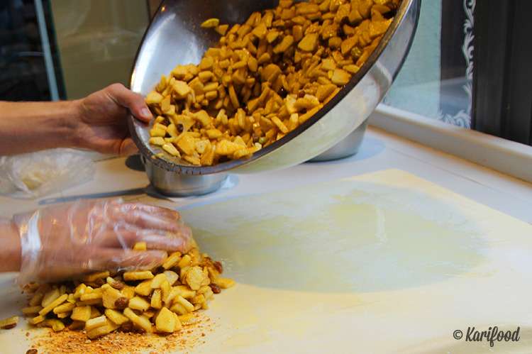 Только с четвертой попытки мне удалось растянуть на руках тесто для штруделя, не превратив его в дырку дырявую. Верьте, ни один другой яблочный штрудель не будет так вкусен как тот, что вы сами вымучаете под присмотром шефа, выстрадав равномерную растяжку теста до состояния прозрачного полотна! Участие в мастер-классе стоит 250 грн с одного человека, проводятся они по субботам и воскресеньям под присмотром мастера в киевском кафе «Львівскі Пляцки» на ул. Спасская, 5.