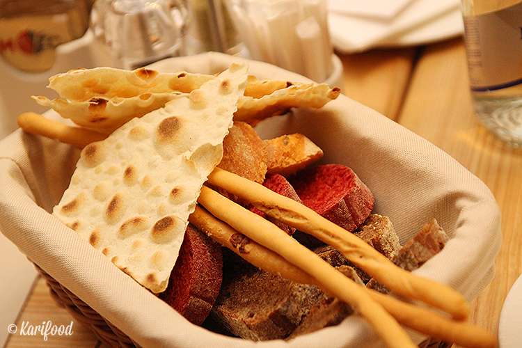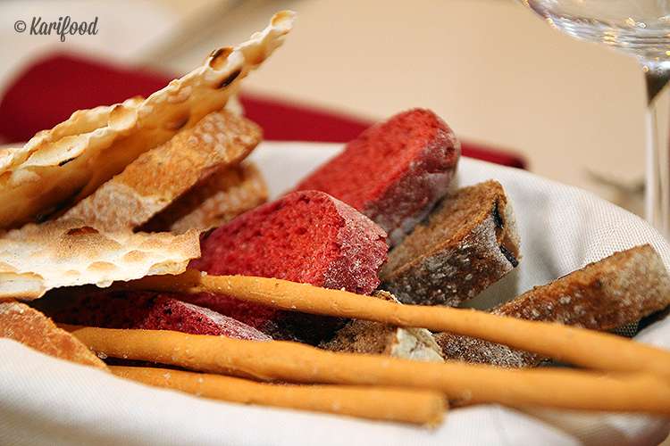Первым на столе появляется хлеб. Его приносят в плетёных корзиночках: здесь и хрустящие грессини, и хрустящая золотистая фокачча, и ароматные деревенские ломти чиабатты и розовый хлеб на свекольном соке.