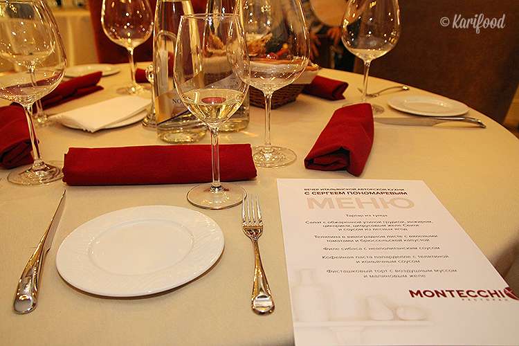 Зимний вечер в новом столичном ресторане Montecchi — особенный, Сергей Пономарёв, бренд-шеф заведений Montecchi-Capuleti, «Прага» и «Марлин», представляет гостям палитру из основных блюд меню. «Вечер итальянской авторской кухни», как лаконично указано в программке, лежащей на каждом столе, на самом деле, больше, чем просто презентация ресторана, больше, чем беглое дегустационное знакомство с кухней или личная встреча с шефом, чьими руками создавалось меню.