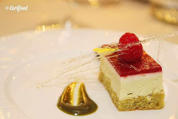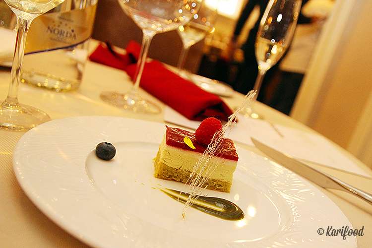 И сладкое безумие на десерт — фисташковый торт с воздушным муссом и малиновым желе на нежном бисквите с облаком сахарных нитей. Какое счастье, что дегустационные порции позволяют добраться через основной срез меню по короткой дороге к сладкому!
