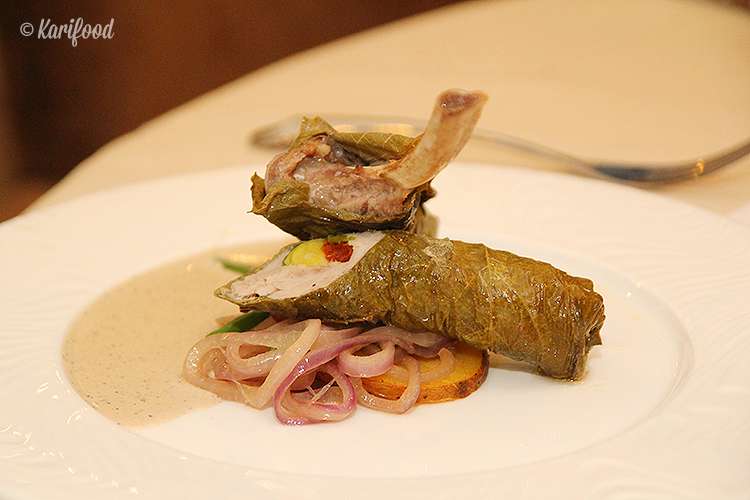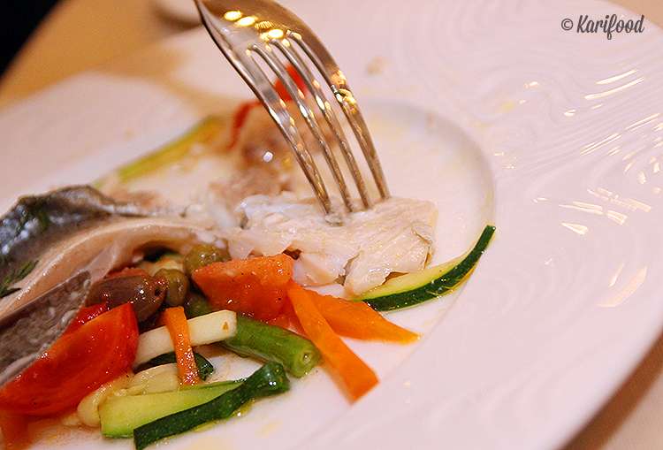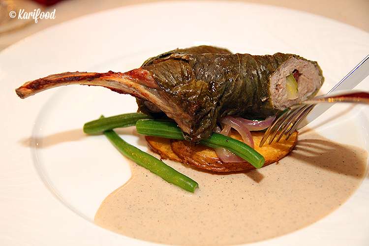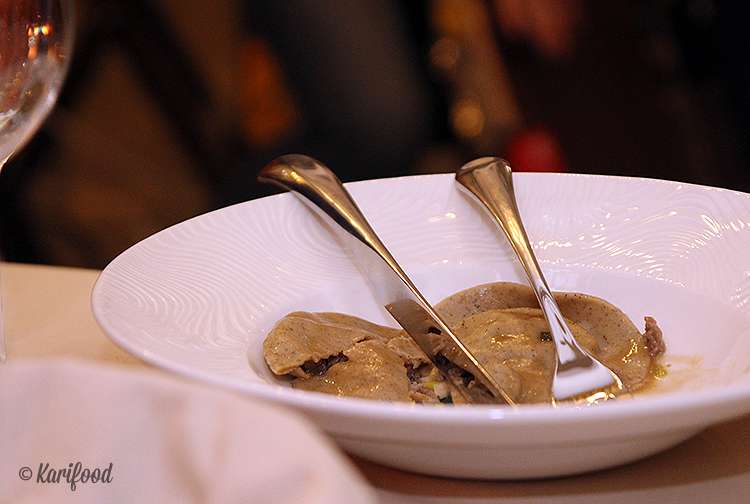 Следом на сцену выходит главный фаворит меню — кофейные равиоли (в тесто добавлен свежемолотый кофе) с телятиной и сладковато-пряным коньячным соусом. Затем филе сибаса с неаполитанским соусом и телятина в виноградном листе с вялеными томатами и брюссельской капустой. Только пристальный взгляд шефа удерживает меня от того, чтобы аккуратно извлечь маленький зеленый кочанчик из тесных мясных объятий под виноградным плащом — очень уж эта капуста на любителя…