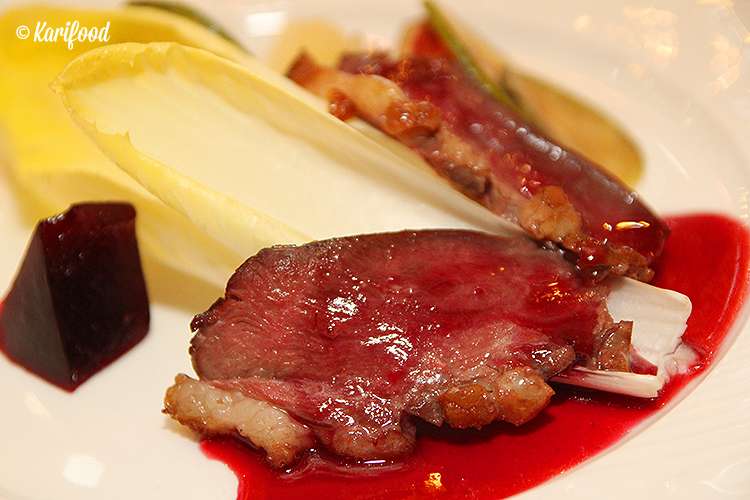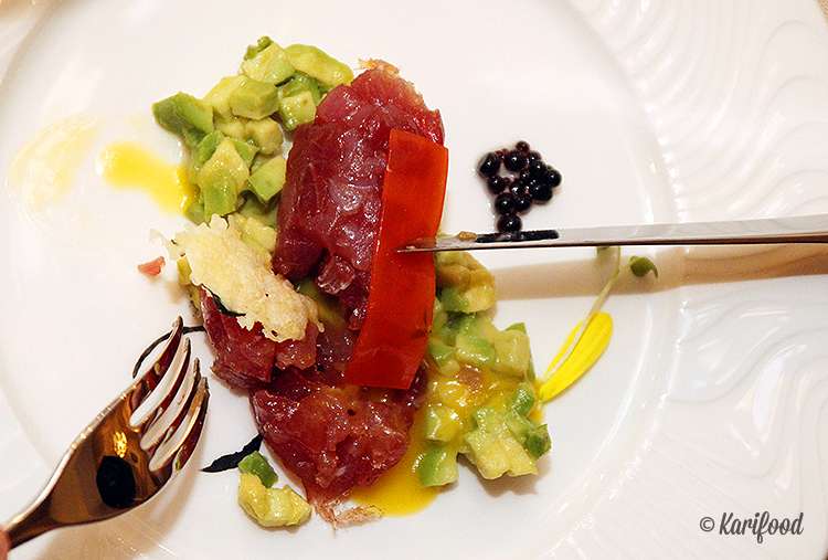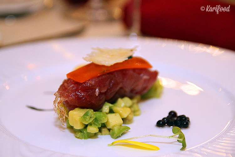 Южный тартар из тунца на подушке из авокадо с жемчужинами бальзамико сменяется салатом с обжаренной утиной грудкой, инжиром, цикорием, цитрусовым желе и соусом из лесных ягод.