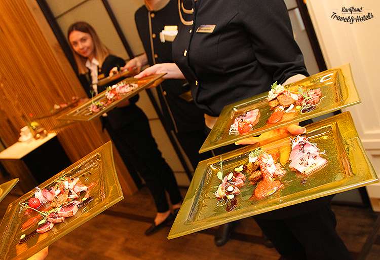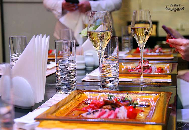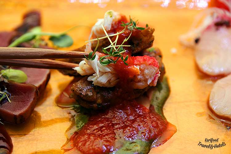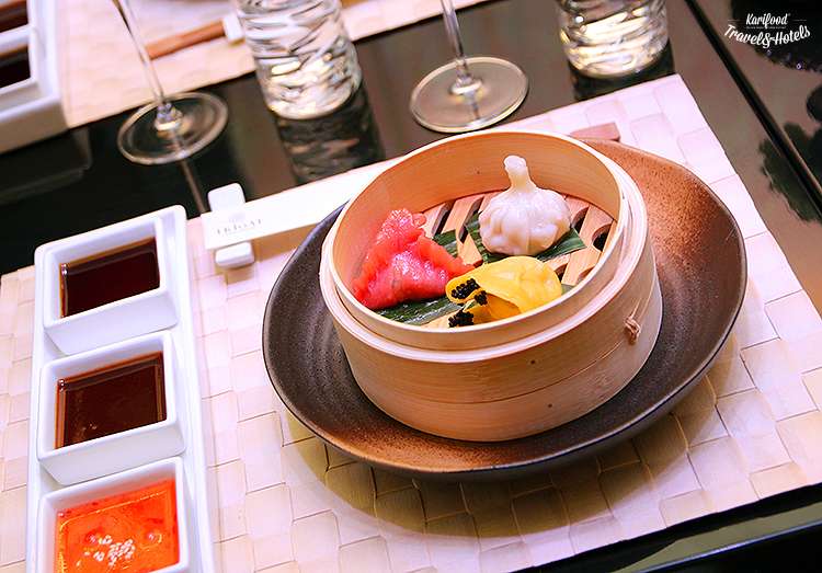 Помимо дим-самов, в меню от шефа ещё есть сашими с трюфельным соусом, татаки-тунец с соусом террияки, королевский краб с томатами, соусом из кориандра и обжаренной кукурузой, мягкопанцирные крабы в перечном соусе, суп том-ям и подкопчённая говядина со сливами и картофелем.