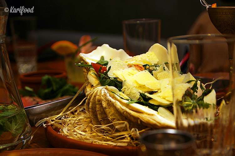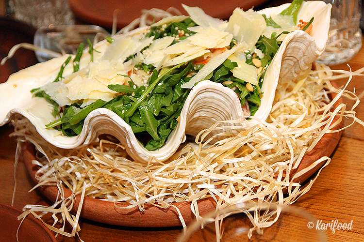Салат с рукколой, ко всему прочему, ещё и невероятно эффектен— он подаётся в гигантских ракушках, которые привозят в ресторан под заказ из Малайзии. В общем, если средства пока не позволяют отправиться на океанические острова, то пусть эти острова станут хотя бы на шаг ближе — доешьте салат и приложите ракушку к уху, вдруг в них до сих пор слышен шум прибоя?