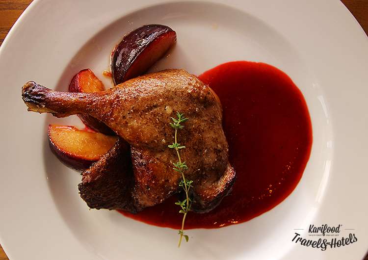 Обильные закуски, всевозможные «намазки» на тонкие ломтики хлеба, не говоря уже о фирменной утиной ножке, которую в осеннем меню подают с кизиловым соусом и сливами, а на десерт роскошная Монастрыская изба под шапкой из сметанного соуса.