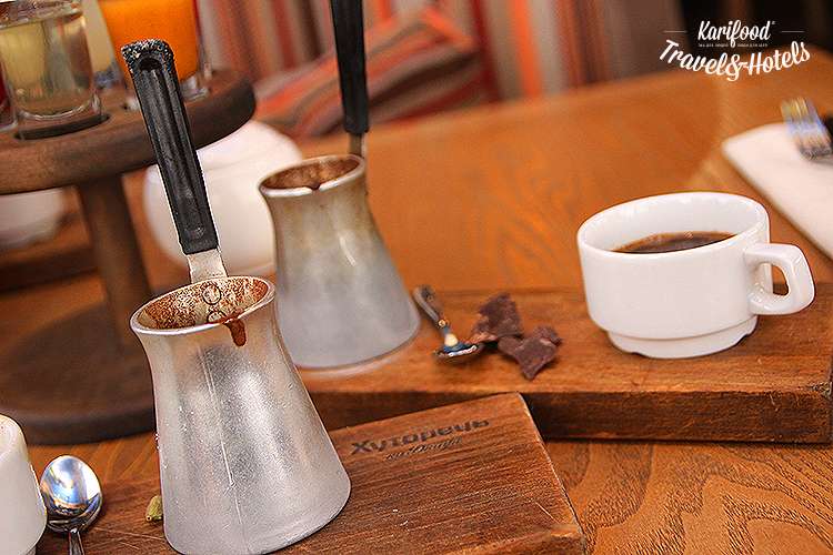 Ну, и для усиления «лечебного эффекта» от еды шефы Хуторца — Петр Самань и Олег Старун — рекомендуют ассорти закусок. Это такое плато, заставленное глиняными мисочками вокруг хлебной горки. Что в мисочках? Во-первых, еврейский салат из сыра и яичного белка, во-вторых, фасоль, перетёртая с грибами, в-третьих, «намазка» из копчёной скумбрии (всё коптят прямо в ресторане) и плошка «намазки» из печёного перца с семечками подсолнуха.