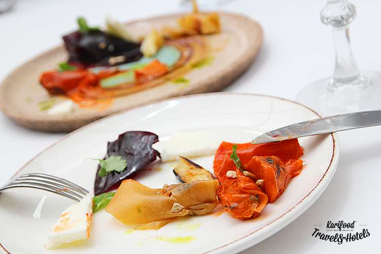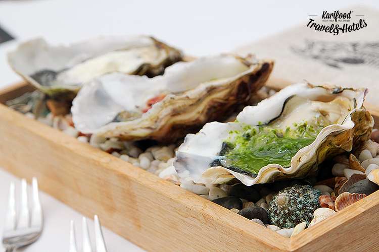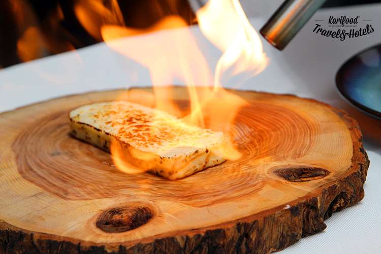 Часть блюд — обожжённый на древесном срезе халуми, мидии на раскалённых камнях или облепиховый сорбет — официанты готовят в зале при гостях.