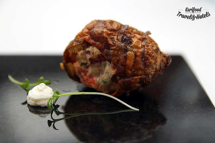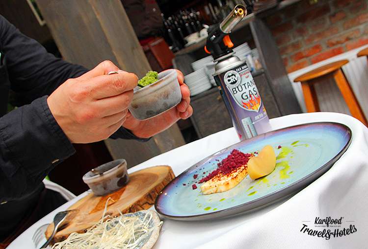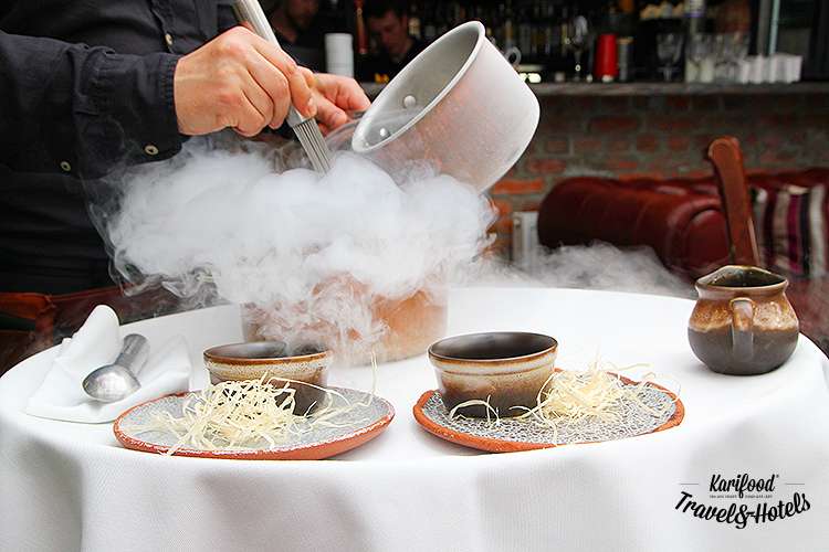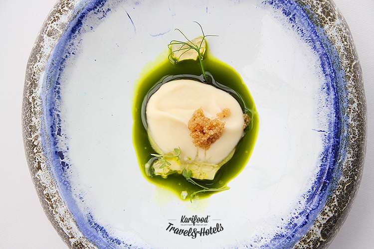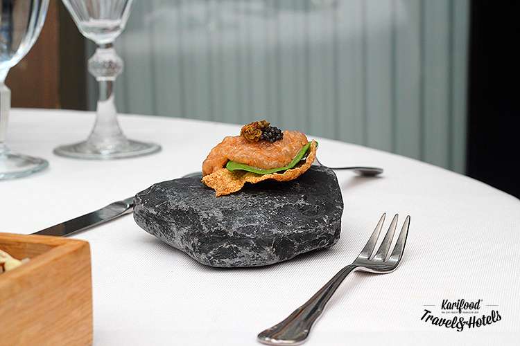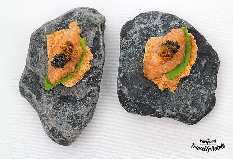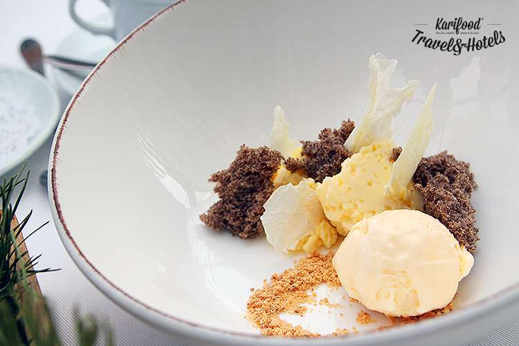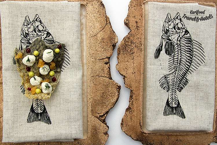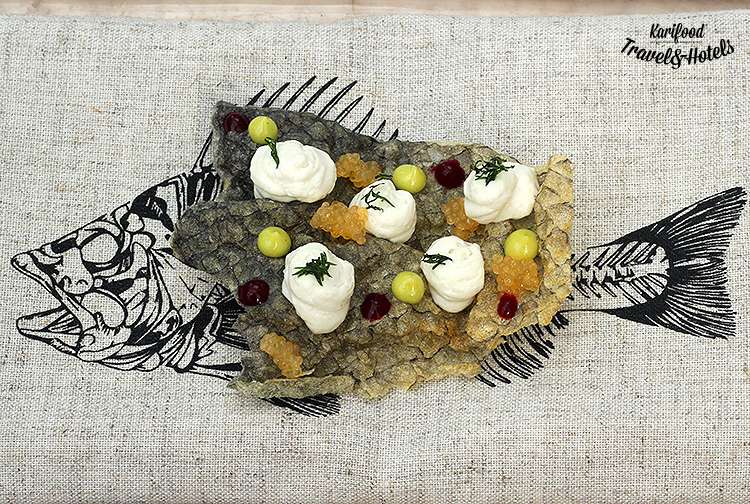 Рыбная шкура с муссом из карасей, молочные чипсы, печенье из еловых шишек, снег из сливочного хрена, пастила из корнеплодов, живой огонь, ледяной пар, камни и мох, чёрная икра, пищевое золото, амарант и наскальные мидии сведены руками шефа Ярослава Артюха в цельное гастрономическое произведение.