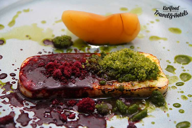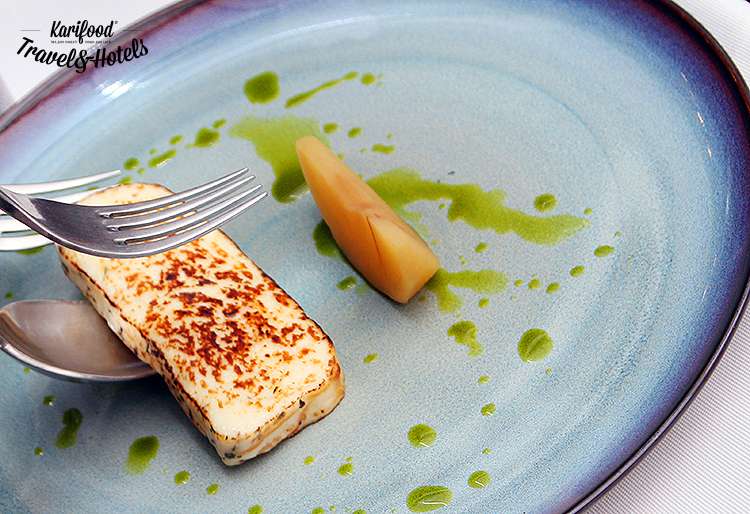 Огоньку сету из 12-ти подач добавляет fire-шоу с подрумяниваем сыра халуми — его обжигают горелкой, быстро посыпают щавелевой и рябиновой гранитой, которые на горячем сыре начинают немедленно таять и превращаться в соус.