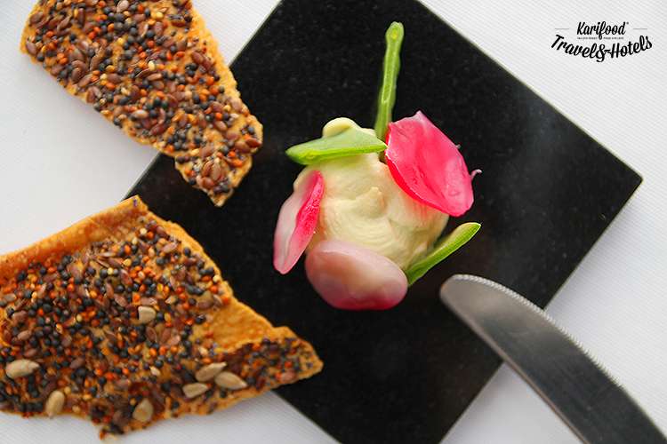 В меню сета есть два многообещающих статиста: белый гречневый чипс с молодым щавелем, тар-таром из рачков и короной из чёрной икры и хлебный чипс с маком, рыжием (тем самым, из которого делают знаменитое рыжиковое масло), овсом и семечками, к которому приносят гороховый хумус с ферментированной (правильно сквашенной) капустой.