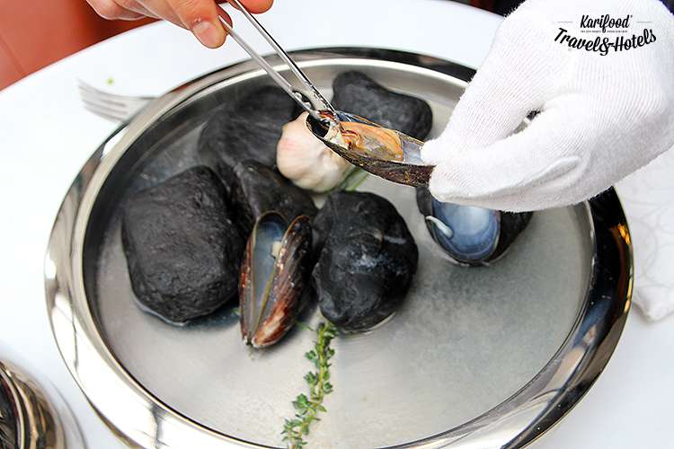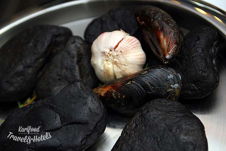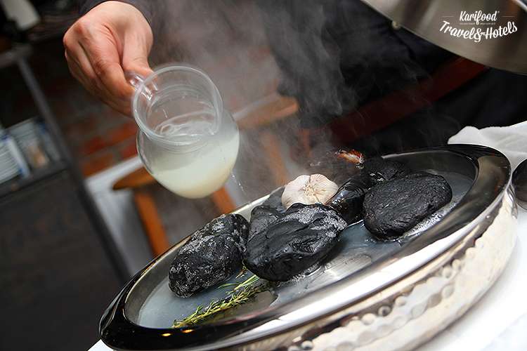 Мидии с яблочным квасом готовят при гостях в зале на горячих чёрных камнях, поливая их рыбным бульоном и тут же выкладывая в приготовленную тарелку с биском, амарантом и сладковатым пюре из сельдерея — моллюск получается мягким, упругим и очень сочным.