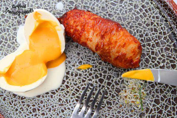 Маленькие гастрономические интермедии с закусками плавно подводят к кульминации действа — подаче «голой» котлеты по-киевски: приготовленной в сувиде без панировки, в тонкой, аппетитной куриной кожице, мясом на косточке от крылышка с текучим горячим маслом внутри и «хитрым» яйцом из сырного соуса и овощного пюре.