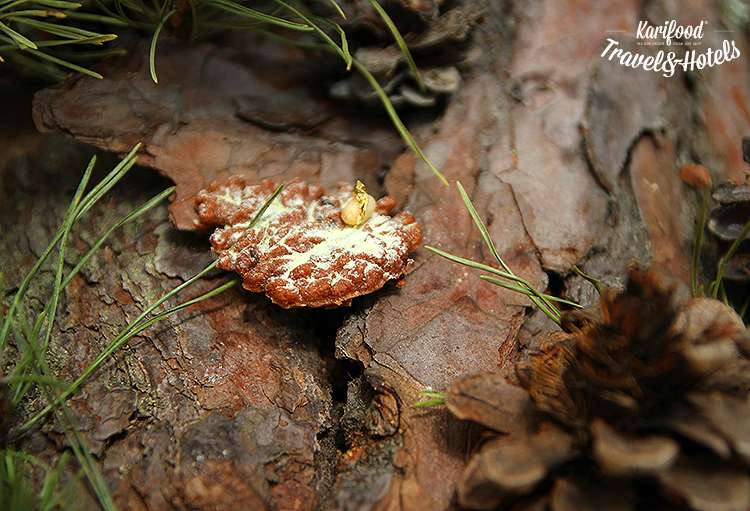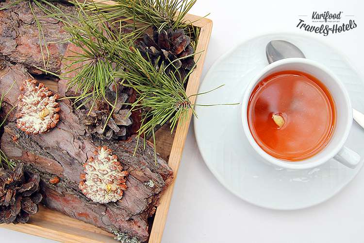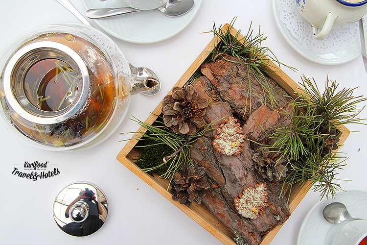 На стол приносят прозрачный чайник и деревянный поднос с подстилкой из мха, древесной коры и сосновых ветвей и съедобные шишки из песочного печенья с кусочками настоящих еловых шишек и пудрой из еловых игл.