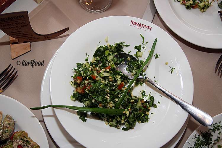 К вину приносят закуски – овощи с ореховой пастой, завернутые в тонкие ломтики печеного баклажана с зеленью, грузинский салат с помидорами, луком и грецкими орехами, пастуший салат «рача» – с пропаренным булгуром и зеленью. Такой салат в горах заменял и до сих пор заменяет пастухам плотный обед – после него можно бодро следовать за отарой по каменным склонам, а не искать ближайший клочок мягкой травы, чтобы всхрапнуть часок-другой.