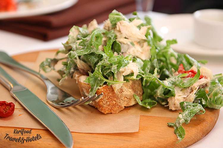 Брускетта с рукколой и макрелью имеет очень «деревенский» вид: не по-ресторанному увесистый ломоть хлеба, кусочки рыбы и много зелени без художественных инсталляций, где-то на стыке небрежности и душевности. А чтобы усилить эффект собственного присутствия не на террасе киевского ресторана, а, например, где-нибудь в белом домике на мысу Марсала брускетту нужно всего лишь обильно полить оливковым маслом и, кусая её, запивать холодным вином.
