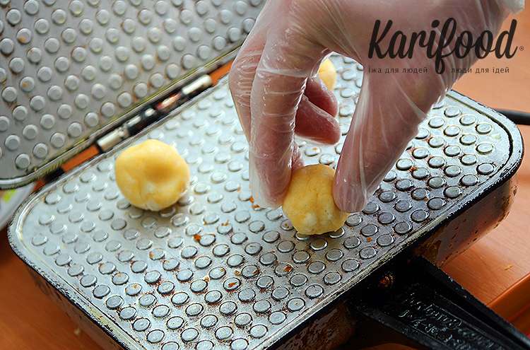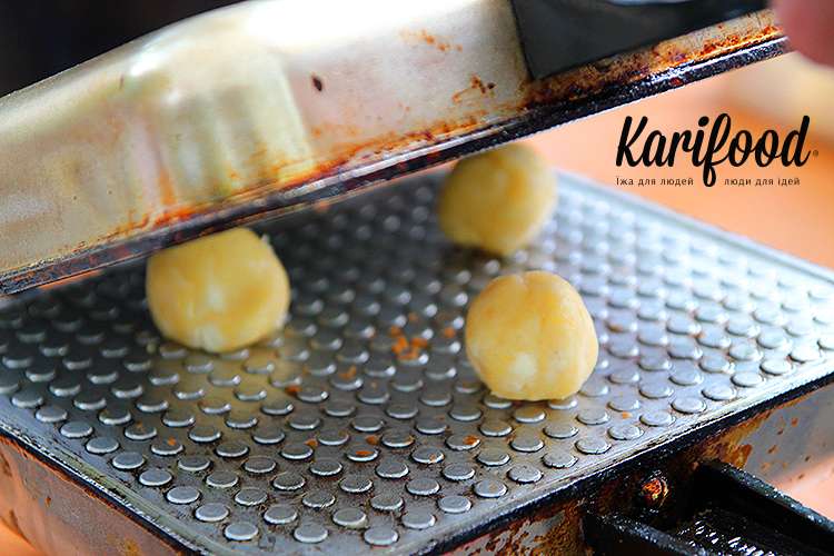 Обязательно посмотреть, как пекут закарпатские соленики на стенде «Сирники та Соленики» — сырные шарики кладут на разогретую вафельницу, прижимают сверху крышкой и через минуту-полторы горячий сырник готов!
