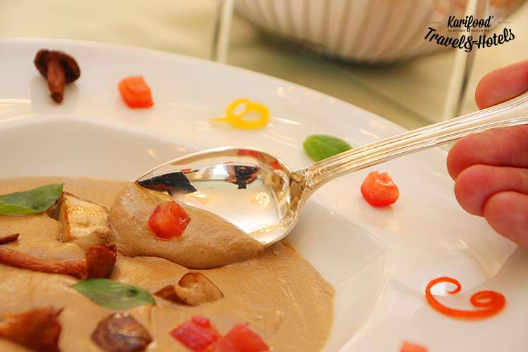 Её крем-суп с лесными грибами и трюфельным маслом ярко пахнет осенью и лесом после дождя. В бархатной текстуре супа соединяются перетёртые лисички и белые грибы с древесным акцентом шиитаке и лёгким флёром трюфельного гриба.
