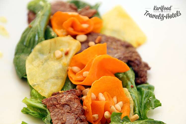 Тёплый салат из ломтиков телятины, тыквой, сочными тёмными листьями шпината с оливковой заправкой и кедровыми орешками — классика на украинских продуктах и итальянских акцентах.
